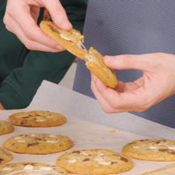6. Faites cuire 9 à 10 minutes seulement : les cookies doivent être dorés sur les bords mais encore très moelleux au centre. Le centre doit rester légèrement mi-cuit pour un effet fondant et tendre.